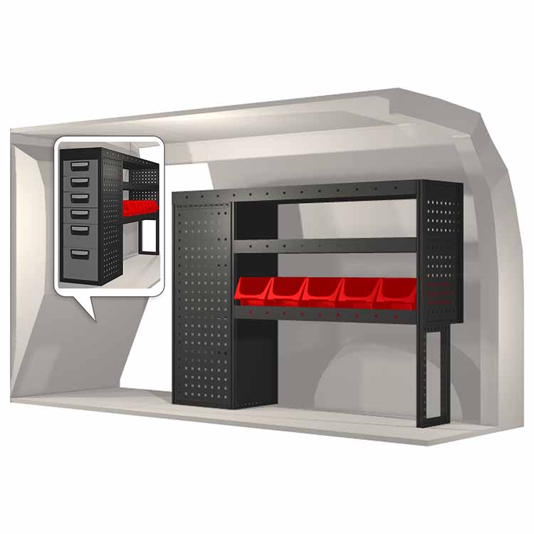 Inredningsförslaget är speciellt utformat för att passa bilmodellen perfekt. I de fall då hurtsar ingår så är dessa utrustade med kullagerskenor samt fullt utdragbara lådor med utdragsstopp. För ökad funktionalitet och minskad ljudnivå under färd är samtliga hyllor utrustade med gummimattor och hurtslådor med skumplast. Monteringssats ingår.