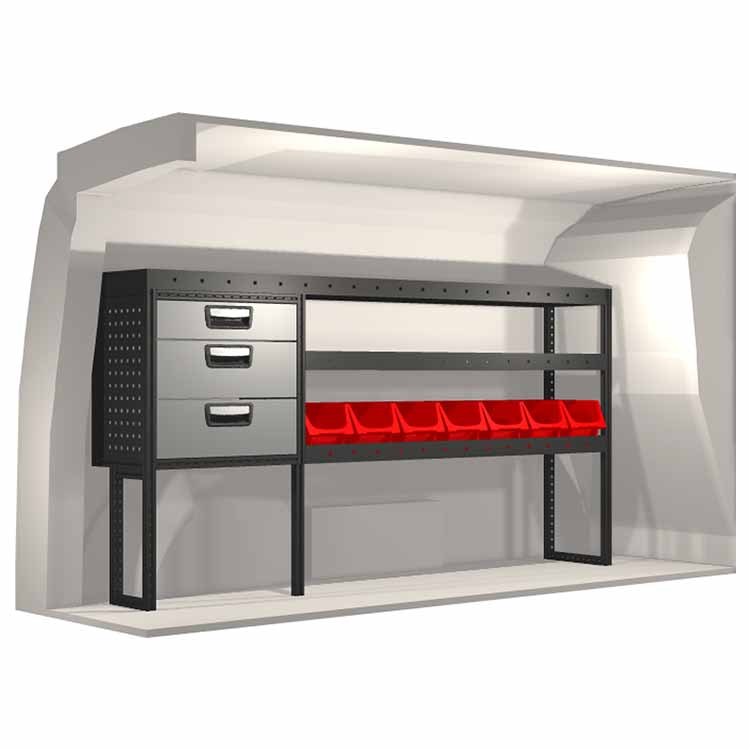 Inredningsförslaget är speciellt utformat för att passa bilmodellen perfekt. I de fall då hurtsar ingår så är dessa utrustade med kullagerskenor samt fullt utdragbara lådor med utdragsstopp. För ökad funktionalitet och minskad ljudnivå under färd är samtliga hyllor utrustade med gummimattor och hurtslådor med skumplast. Monteringssats ingår.