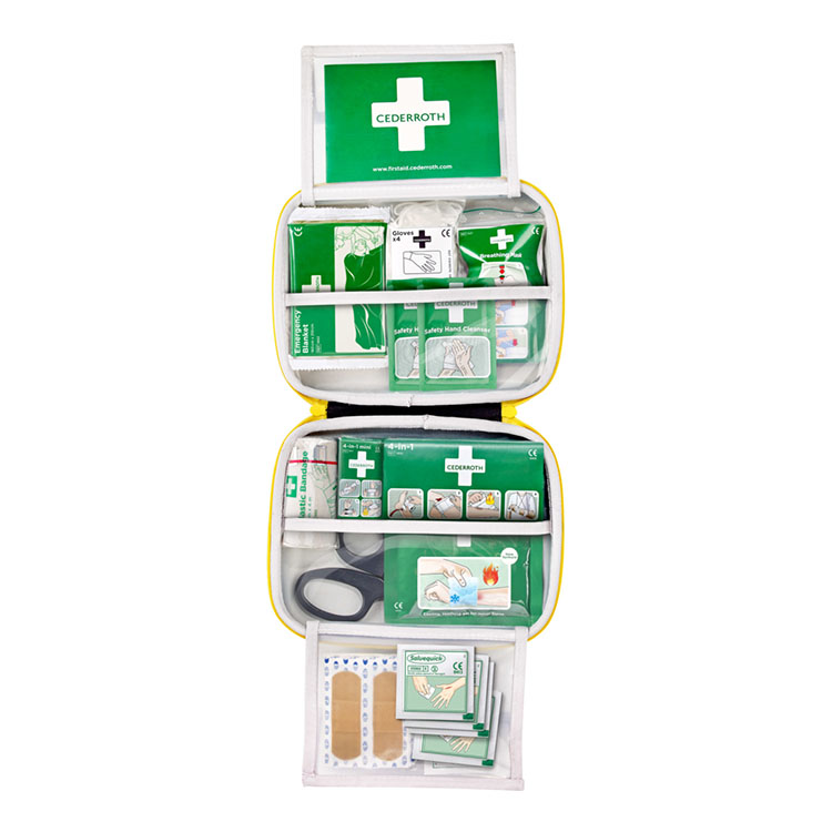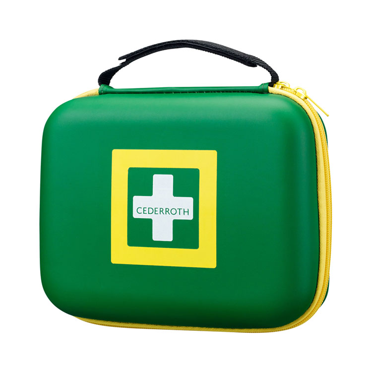 Första hjälpen-väska konstruerad i ett slitstarkt gummiliknande material med matt yta för att hålla damm, fukt och smuts utanför. Utrustningen hålls hygieniskt ren och är alltid redo att användas. Produkterna är packade i transparenta plastfickor för tydlig översikt och det är lätt att hitta rätt produkt när varje sekund räknas. Alla produkter är försedda med tydliga självförklarande instruktioner. Signalfärgerna grönt och gult gör väskan synlig på långt håll. Praktiskt handtag med justerbart kardborrband gör det enkelt att fästa väskan eller bära den med sig.