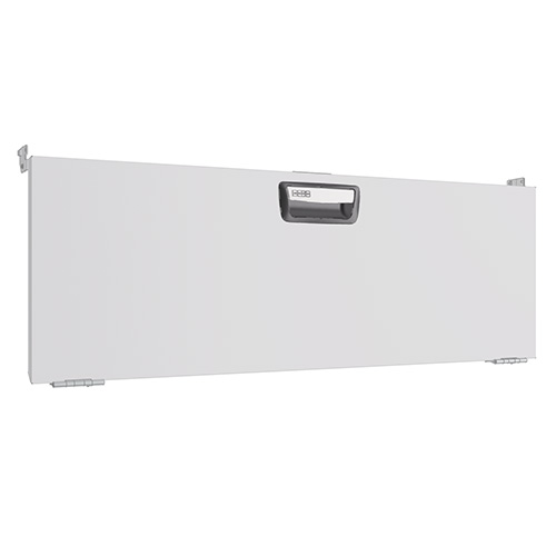 Luckan är utrustad med gasfjädrar på båda sidor för en mjukare öppnings- och stängningsfunktion. Öppningsvinkel 90 grader. Luckans handtag har en inbyggd spärr som hindrar den från att öppnas under färd. Passar även hjulhusstativ som har försetts med arbetsplatta. Vid montering mellan två hyllstegar måste en monteringsram användas.