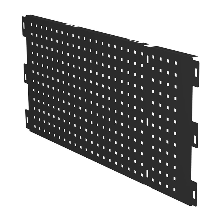Verktygsplåt för extra lång hurts. Plåten skyddar den extra långa lådan och bidrar till en snygg design. Plåten har 9 mm fyrkantshål med centrumavstånd 34 mm, vilket möjliggör montering av verktygshållare och andra tillbehör. Installeras med skruv (medföljer ej).