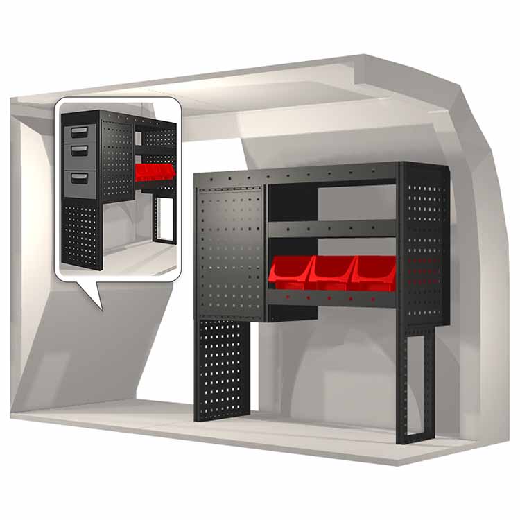 Inredningsförslaget är speciellt utformat för att passa bilmodellen perfekt. I de fall då hurtsar ingår så är dessa utrustade med kullagerskenor samt fullt utdragbara lådor med utdragsstopp. För ökad funktionalitet och minskad ljudnivå under färd är samtliga hyllor utrustade med gummimattor och hurtslådor med skumplast. Monteringssats ingår.