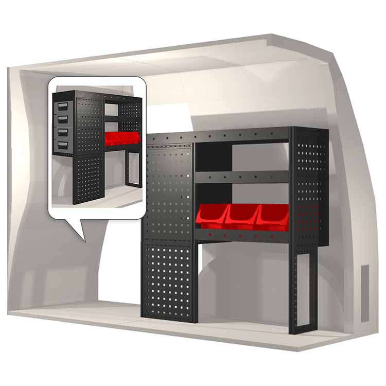 Inredningsförslaget är speciellt utformat för att passa bilmodellen perfekt. I de fall då hurtsar ingår så är dessa utrustade med kullagerskenor samt fullt utdragbara lådor med utdragsstopp. För ökad funktionalitet och minskad ljudnivå under färd är samtliga hyllor utrustade med gummimattor och hurtslådor med skumplast. Monteringssats ingår.