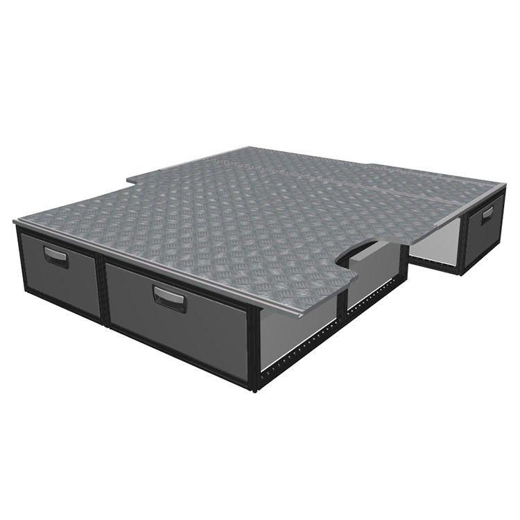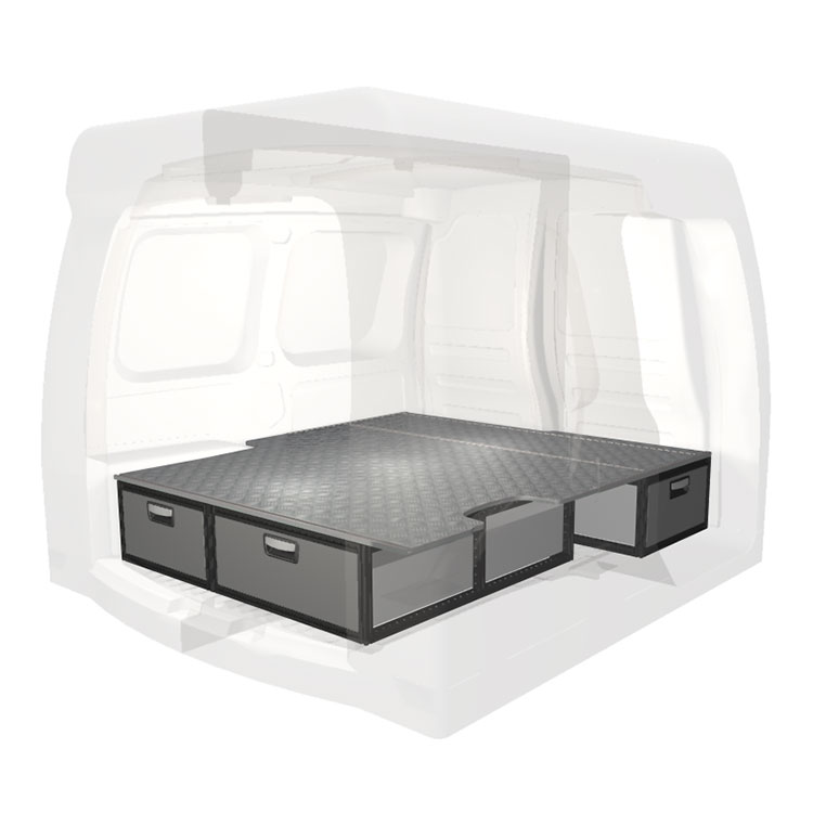 Kitet är designat för installation ovanpå ett trägolv. Dubbelgolvets skenor möjliggör enkelt montage av fordonsinredning och kantlister bidrar till en snygg finish.