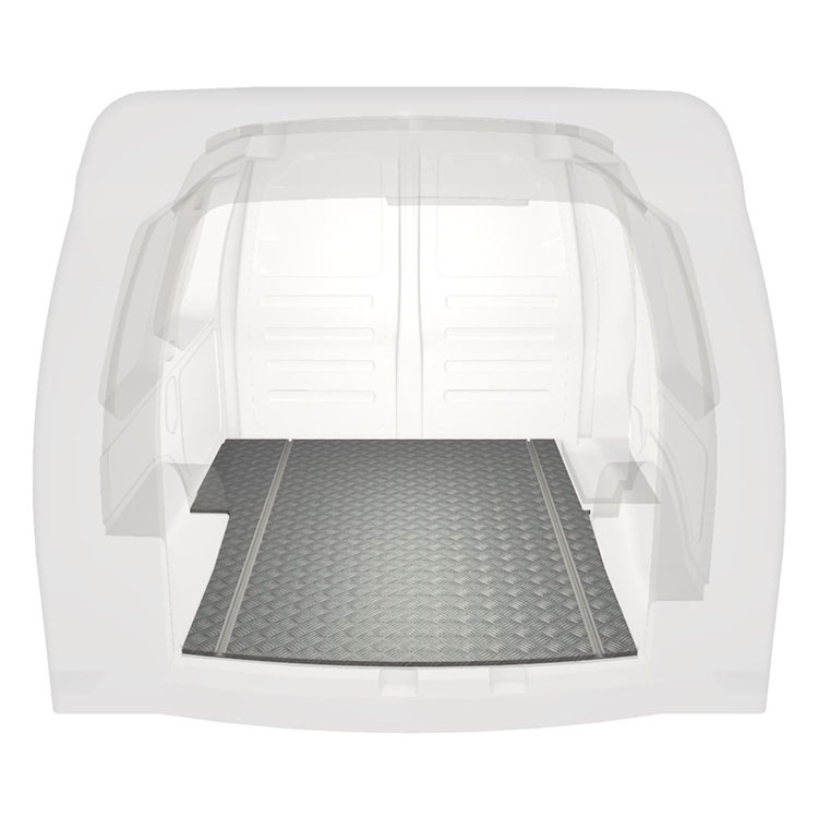 Lätt och robust golv med halkfri aluminiumdurk till en Volkswagen Caddy. Golvets integrerade skenor (längsgående) används för snabb och säker installation av bilinredning och andra tillbehör.