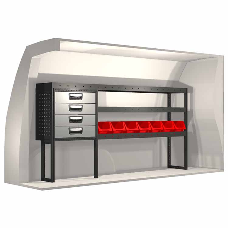 Inredningsförslaget är speciellt utformat för att passa bilmodellen perfekt. I de fall då hurtsar ingår så är dessa utrustade med kullagerskenor samt fullt utdragbara lådor med utdragsstopp. För ökad funktionalitet och minskad ljudnivå under färd är samtliga hyllor utrustade med gummimattor och hurtslådor med skumplast. Monteringssats ingår.