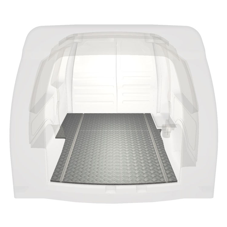 Lätt och robust golv med halkfri aluminiumdurk till en Volkswagen Caddy Maxi. Golvets integrerade skenor (längsgående) används för snabb och säker installation av bilinredning och andra tillbehör.