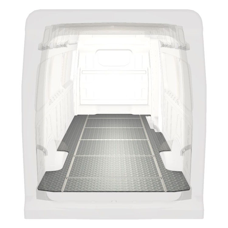 Lätt och robust golv med halkfri aluminiumdurk till en Volkswagen Crafter / MAN TGE . Golvets integrerade skenor (längsgående och tvärgående) används för snabb och säker installation av bilinredning och andra tillbehör.