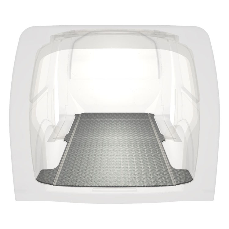 Lätt och robust golv med halkfri aluminiumdurk till en Volkswagen Transporter T6. Golvets integrerade skenor (längsgående) används för snabb och säker installation av bilinredning och andra tillbehör.