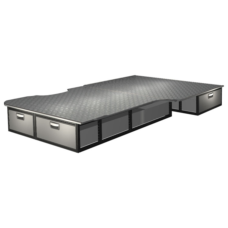 Kitet är designat för installation ovanpå ett Modul-Floor, där det undre golvets skenor nyttjas för en icke-förstörande installation. Dubbelgolvets skenor möjliggör enkelt montage av fordonsinredning och kantlister bidrar till en snygg finish.