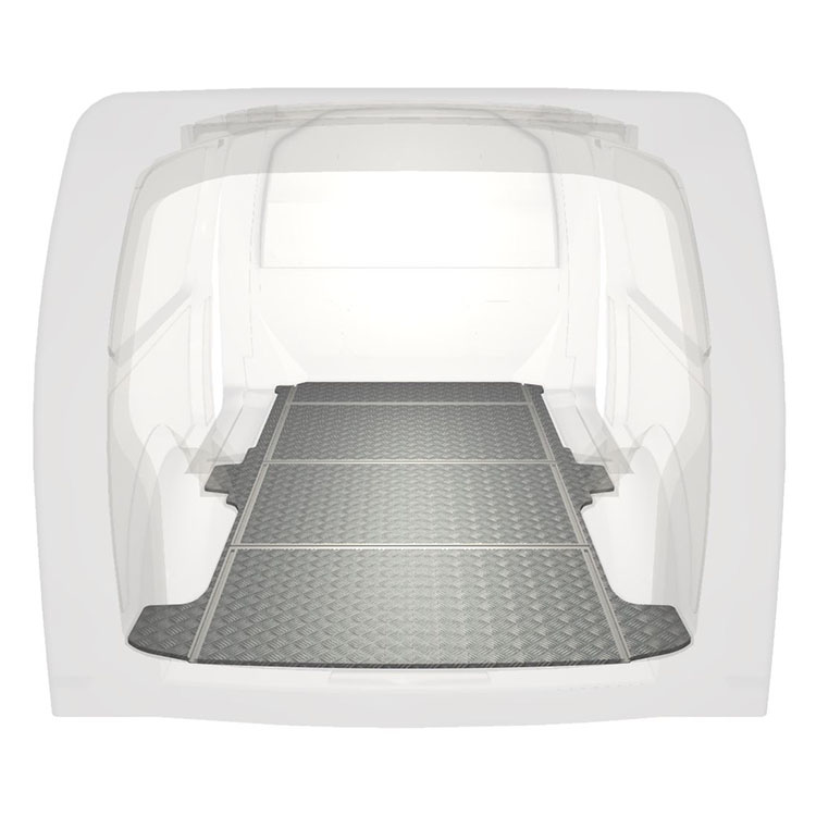 Lätt och robust golv med halkfri aluminiumdurk till en Volkswagen Transporter T6. Golvets integrerade skenor (längsgående och tvärgående) används för snabb och säker installation av bilinredning och andra tillbehör.